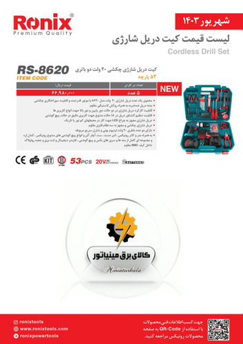 کیت دریل شارژی چکشی 20 ولت 2 باتری 53 پارچه رونیکس مدل RH-8620
