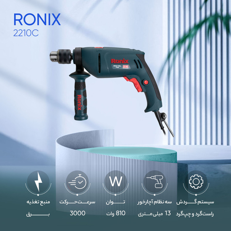 دریل چکشی فوق یکی از محصولات تولیدی شرکت «رونیکس» (Ronix) است که تحت عنوان مدل «2210C» به بازار عرضه میشود. این محصول به دلیل چکشی بودن برای سوراخکاری گچ و سیمان نیز مناسب است.
