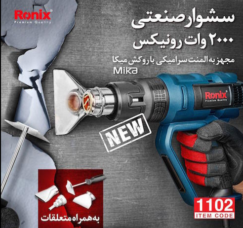 سشوار صنعتی برقی 2000 وات دیمردار رونیکس مدل 1102، در فعالیتهای مختلف نظیر صافکاری و نقاشی اتومبیل، نجاری و مصارف خانگی، وکیوم درب مواد غذایی، آبکاری سیمهای الکتریکی، صنایع دستی، کار با رزین اپوکسی، تعمیرات تلفن همراه و لوازم الکترونیکی و ... تنوع کاربری گستردهای را از خود نشان میدهد. در این دستگاه، مکانیزم کنترل دائمی دما، انجام کارهای مداوم برای کاربر امکانپذیر کرده است.