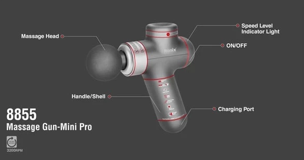 ماساژور شارژی مینی رونیکس دارای بدنهای سبکوزن با دستهای ارگونومیک است که موجب سهولت استفاده از آن میشود. چراغ نشانگر میزان سرعت، چراغ باتری، درگاه شارژ و کلید قطع و وصل در این بدنه قرار میگیرند. با فشار دادن کلید خاموش و روشن به مدت دو ثانیه، دستگاه شروع به کار میکند و با هر بار فشاردادن کلید، سطح سرعت یک مرحله بیشتر میشود تا در نهایت به سطح چهارم یعنی سرعت تناوبی دستگاه برسد. سپس با فشاردادن کلید، دستگاه مجدداً به سرعت سطح 1 بر میگردد.