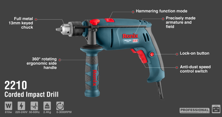 دریل چکشی 13 میلیمتری 2210 رونیکس، مجموعهای کامل و بدون نقص از امکانات و ویژگیهایی است که مطابق نیاز کاربران مختلف خانگی و صنعتی طراحی شده است. ابزاری همه چیز تمام که میتوانید از قابلیتهای بیشمار آن استفاده کنید و از کارکردن با آن لذت ببرید!
