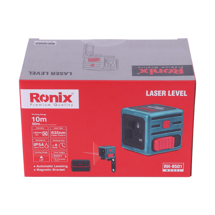 تراز لیزری دو خط رونیکس مدل RH-9501 دارای عملکرد دو خط قرمز عمودی و افقی، دارای قابلیت نمایش خطوط به صورت همزمان برای انجام طیف وسیعی از فعالیت، مجهز به خود ترازی اتوماتیک با دقت بالا، دارای قابلیت پاندول، دارای بدنه ای بسیار مستحکم و پوشیده شده از رابر مقاوم در برابر ضربه، ضد گرد و غبار و مقاوم در برابر رطوبت و سقوط از دست کاربر با استاندارد بین المللی IP54 ، دارای قابلیت کار با لوازم جانبی مختلف برای انجام عموم فعالیت ها و همچنین مجهز به پایه آهنربایی منحصر به فرد را میتوان از ویژگی های مهم این دستگاه به شمار آورد