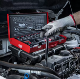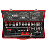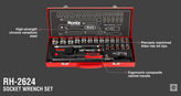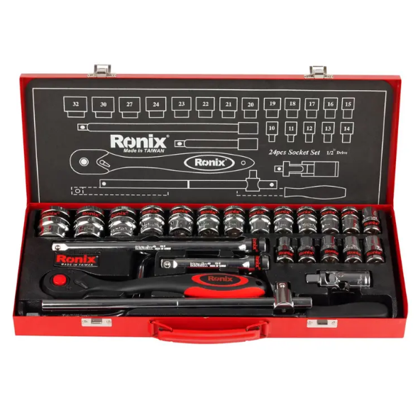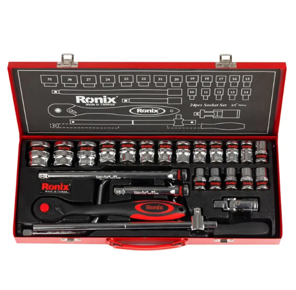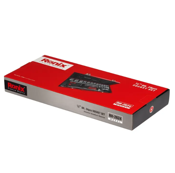 مجموعه بکس 24 عددی رونیکس مدل RH-2624 مجموعه ای دارای 24 قطعه، ساخته شده از مواد باکیفیت سخت کاری شده با گشتاور بالا می باشد. این ست دارای سوکت های فولادی از جنس کروم وانادیوم با مقاومت و استحکام بالا است که با کروم شفاف آینه ای روکش شده اند تا در برابر زنگ زدگی و خوردگی مقاوم باشند. لبه سوکت ها در این محصول به دقت تراش خورده اند که این ویژگی با ایجاد اندازه های دقیق و انتهای مورب در سوکت ها، قرار دادن بکس بر سطح کار را آسان نموده و از خود دستگاه و سطح کار در برابر آسیب حاصل از لبه های تیز سوکت محافظت میکند.