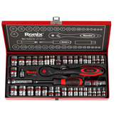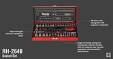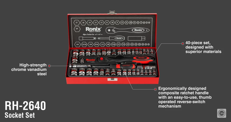 مجموعه بکس 40 عددی 3/8 اینچ دسته TPR رونیکس مدل RH-2640مجموعه ای دارای 40 قطعه، ساخته شده از مواد باکیفیت سخت کاری شده با گشتاور بالا می باشد. این ست دارای سوکت های فولادی از جنس کروم وانادیوم با مقاومت و استحکام بالا است که با کروم مات مشکی روکش شده اند تا در برابر زنگ زدگی و خوردگی مقاوم باشند. لبه سوکت ها در این محصول به دقت تراش خورده اند که این ویژگی با ایجاد اندازه های دقیق و انتهای مورب در سوکت ها، قرار دادن بکس بر سطح کار را آسان نموده و از خود دستگاه و سطح کار در برابر آسیب حاصل از لبه های تیز سوکت محافظت می کند.
