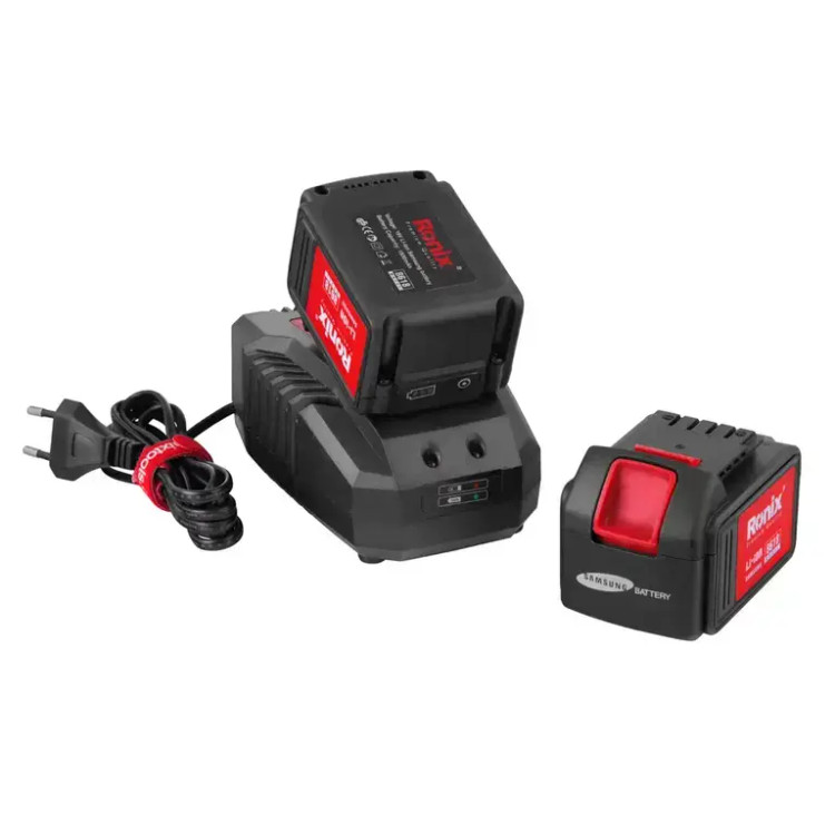 یک جفت باتری لیتیوم یون 18 ولت و 1.5 آمپرساعتی با قابلیت شارژ سریع؛ کارایی و طول عمر بالا؛ قابل استفاده در تمام محصولات All In One سری 86 رونیکس؛ دارای سیستم شارژ سریع با بهترین عملکرد