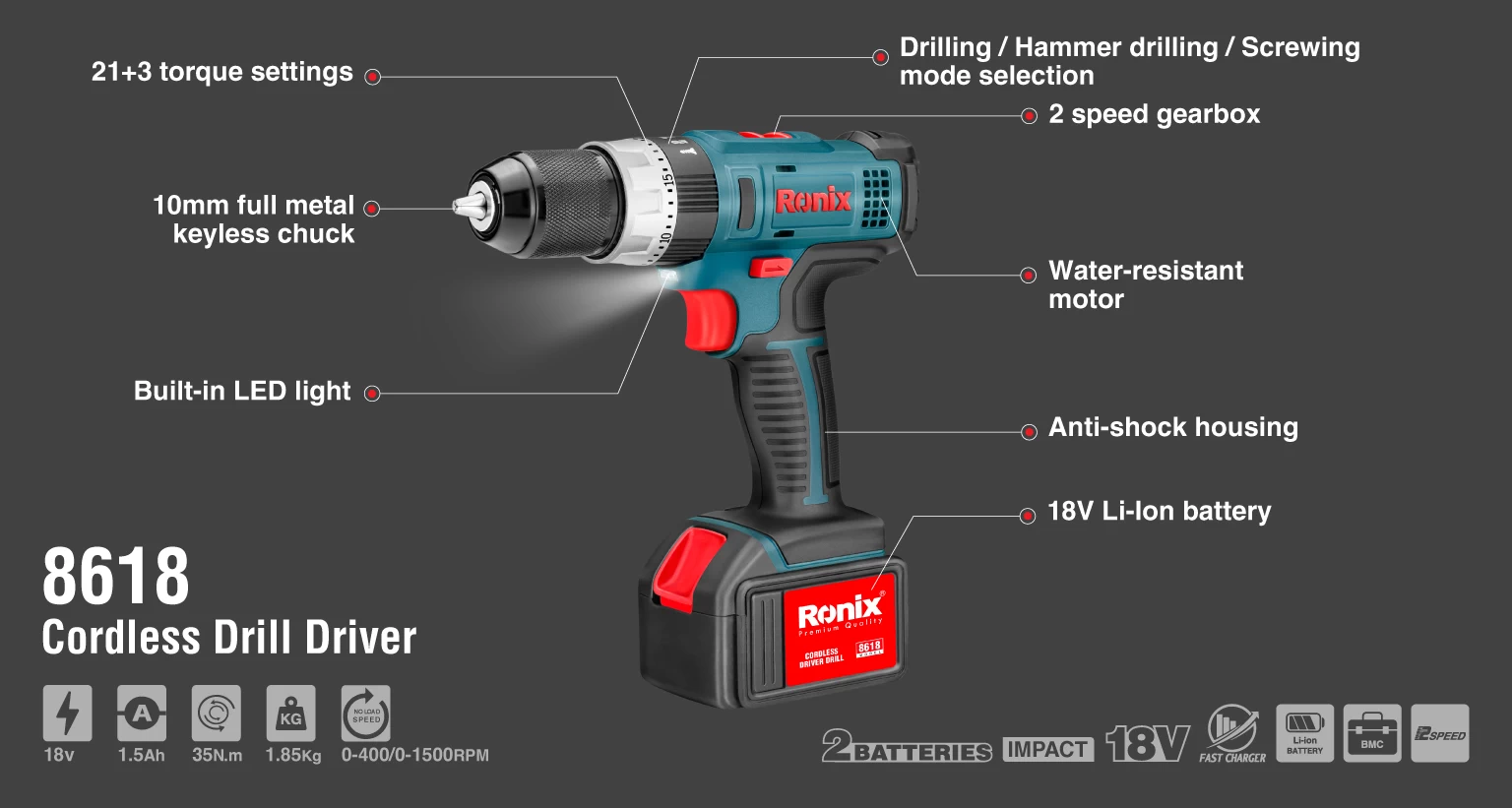 منبع تغذیه این دریل یک باتری لیتیوم یون 18 ولت با ظرفیت 1.5 آمپرساعت است که میتوانید آن را در تمام ابزارهای سری 86 رونیکس استفاده کنید.